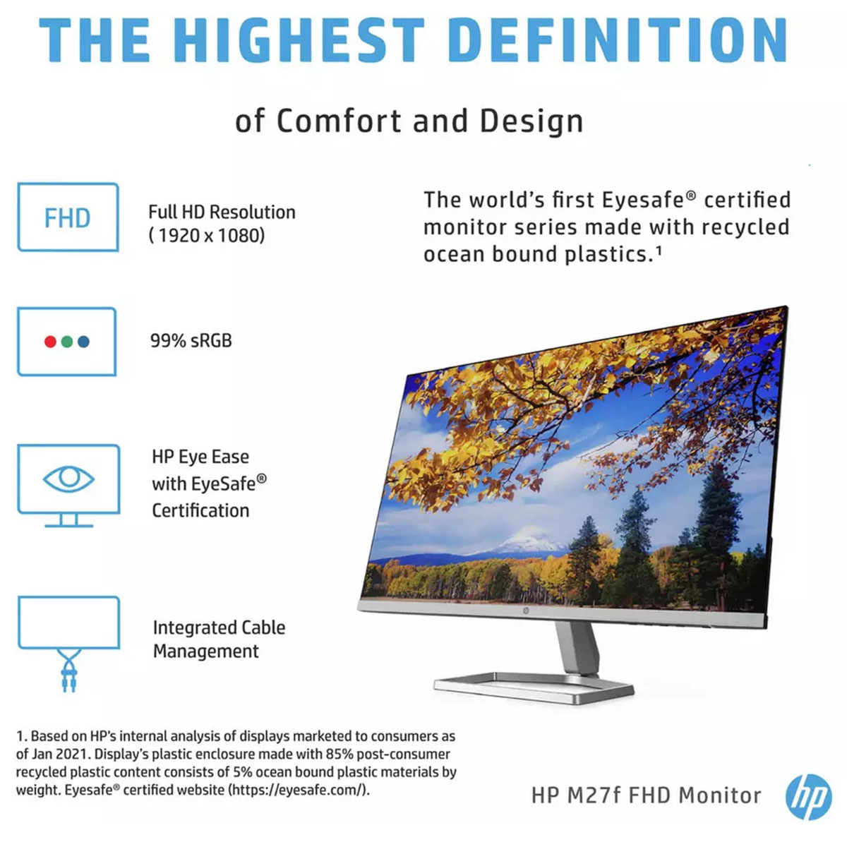 Increase viewing comfort with Eyesafe technology that doesn’t sacrifice color quality. Monitor designed with sustainability in mind with 85% recycled materials and packaged in recycled materials[1]. Doing good never looked so good.